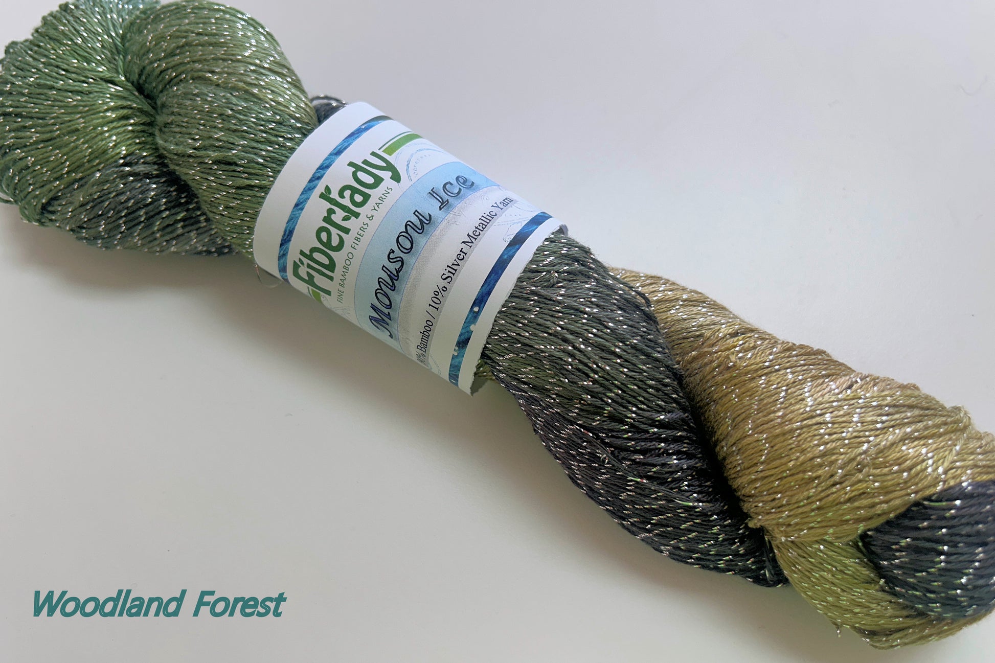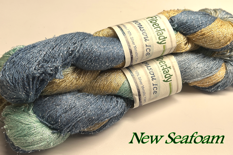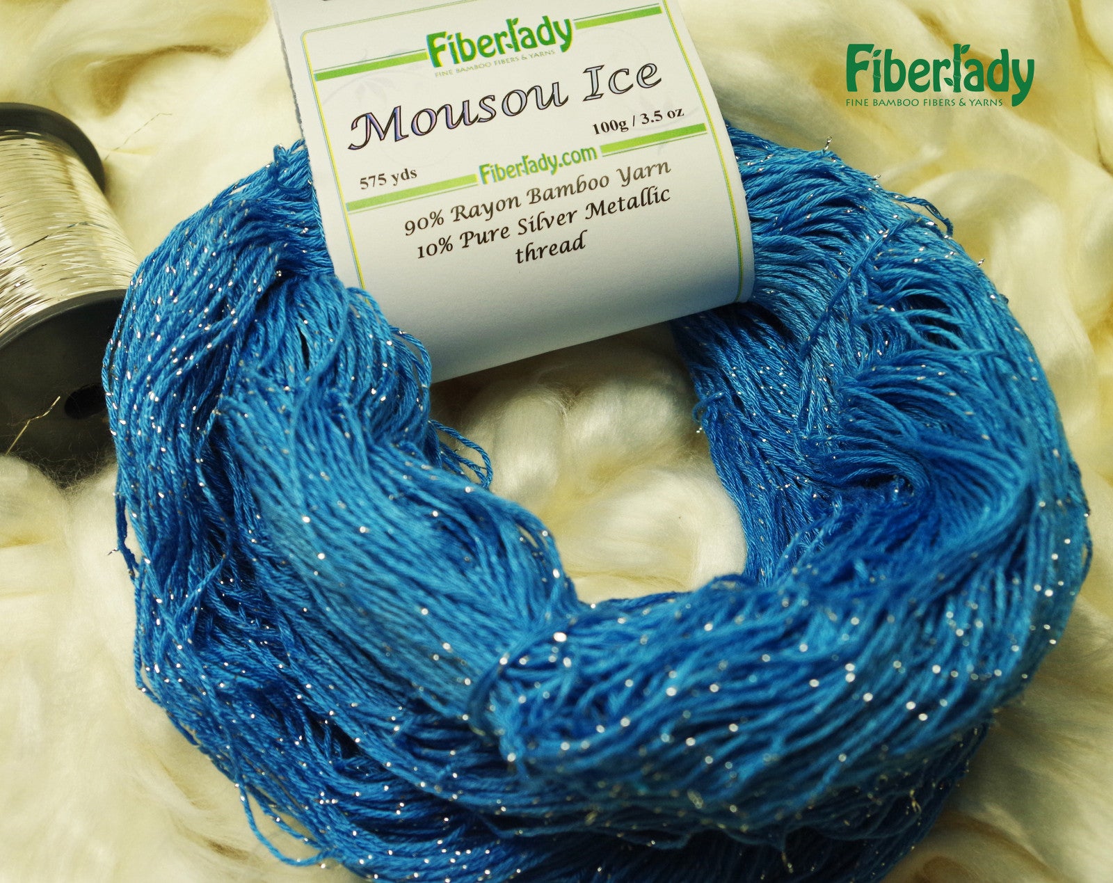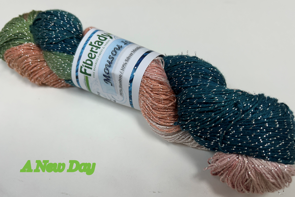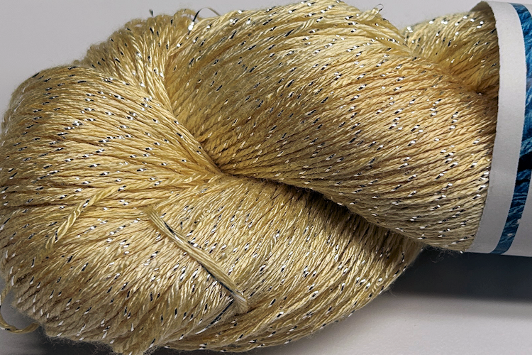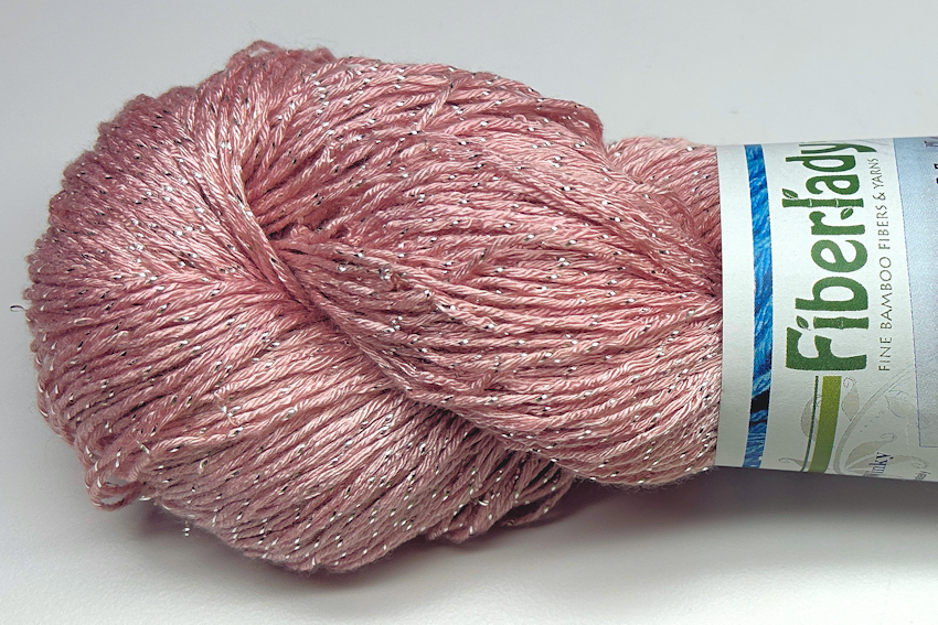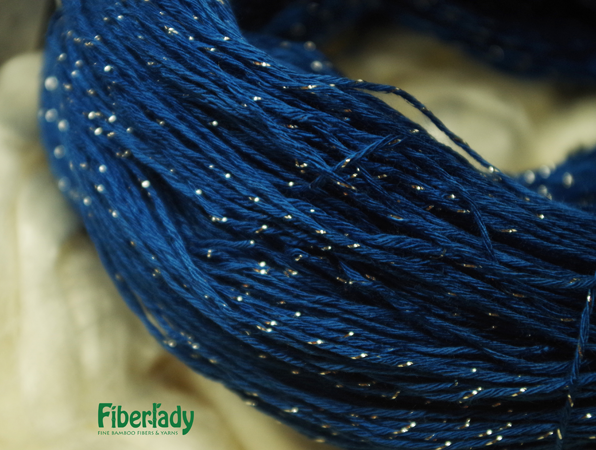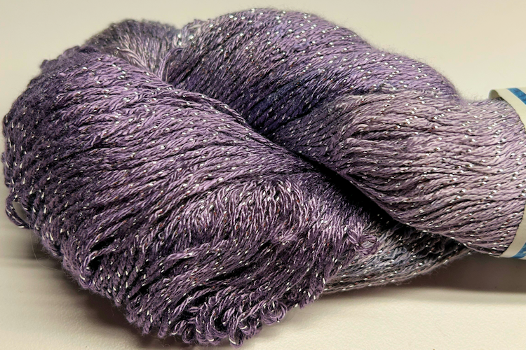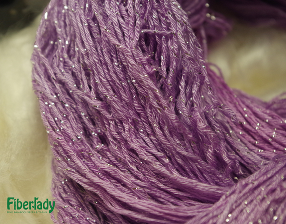 Fingering weight bamboo metallic yarn with a stand of Pure Silver twisted in. 90% bamboo/10% pure silver metallic yarn, 575 yd skein, 3.5 oz/100g skein, 2300 yd/lb 19-24 wpi, 32 sts = 35 rows = 4"